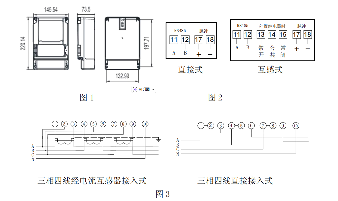 1 计量功能:有功电能计量,并存储数据。三相电源供电,一相或两相断电,计量准确度不受影响。